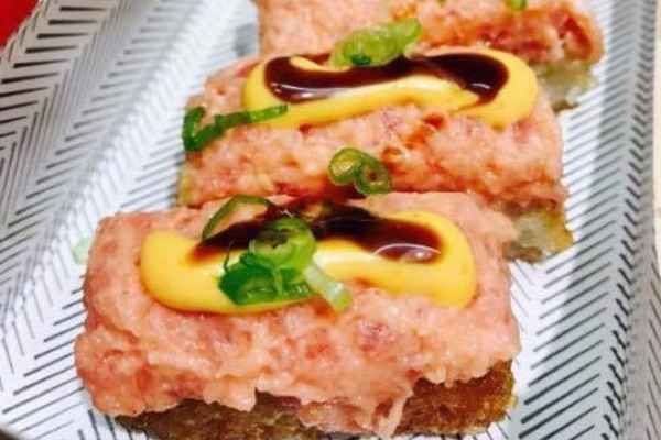 Crunchy tuna rice paper sushi roll is filled with rice, tuna, assorted vegetables, crispy pinko and wrapped in rice paper and topped with…