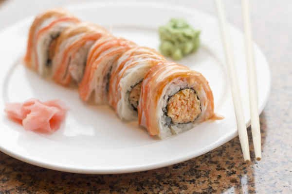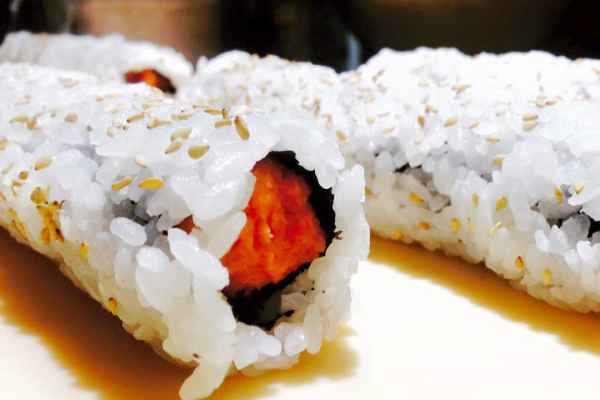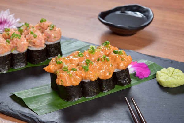 Rice and nori sushi roll stuffed with spicy crabmeat.