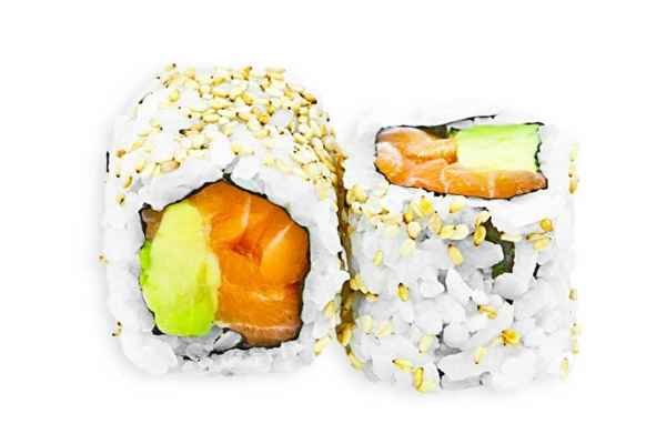 Sushi roll with rice, nori, creamy avocado and fresh, raw salmon.